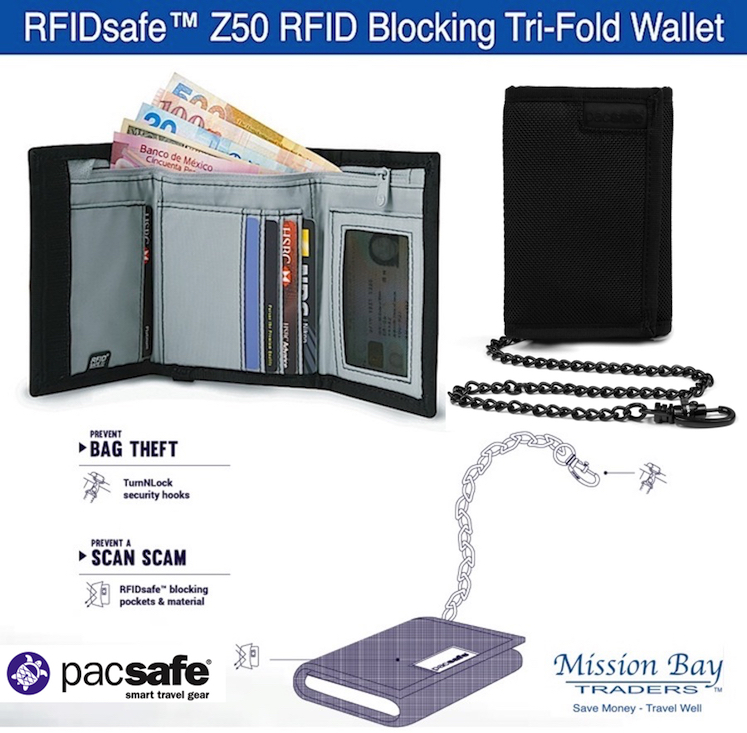 Pacsafe RFIDsafe V50 Anti-Theft Compact Travel Wallet . The Pacsafe RFIDsafe Z50 anti-theft tri-fold wallet with chain organization capabilities & slashproof strap to keep your cash and cards close to you at all times.